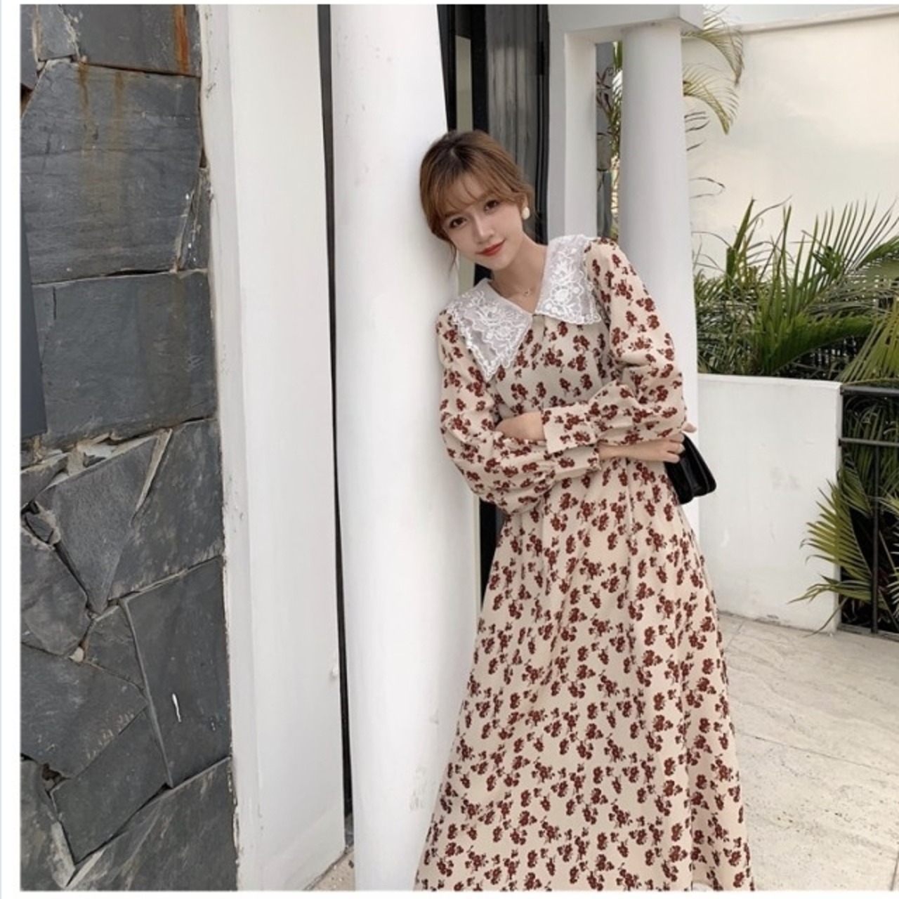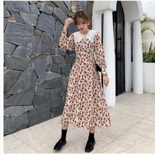 花柄 ロングワンピース 長袖 ロング ワンピース 春秋 ロング丈 マキシ丈 長袖 花柄 レース 可愛い ハイウエスト レトロ ガーリー ブラッ