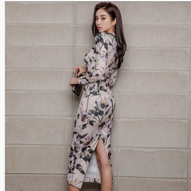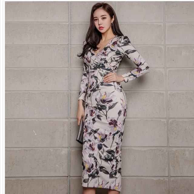 大人 ワンピース タイト 膝丈 タイトワンピース ひざ丈 マーメードライン Vネック 花柄 フリル シンプル カジュアル セクシー レディー
