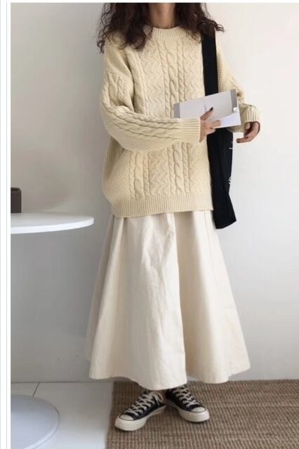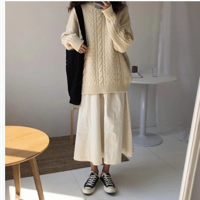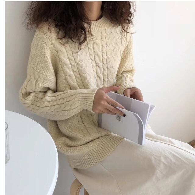 ゆるニット ニット セーター ケーブルニット トップス レディース バックシャン バルーン袖 無地 秋 冬 ミディアム丈 オフタートルネッ