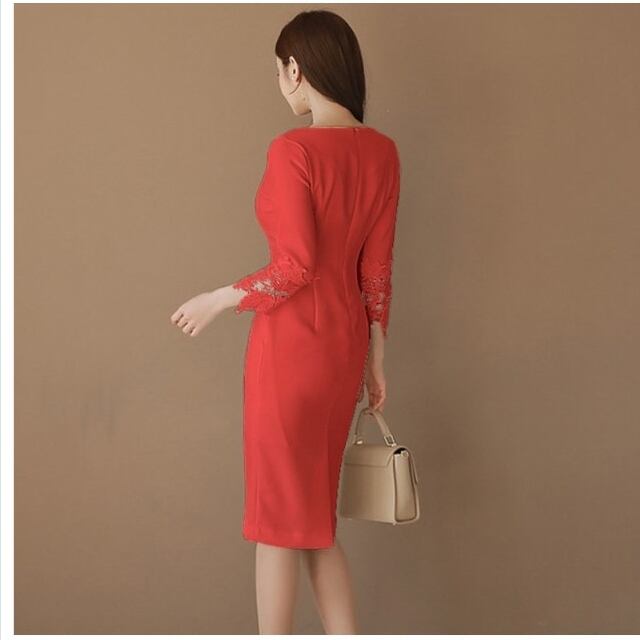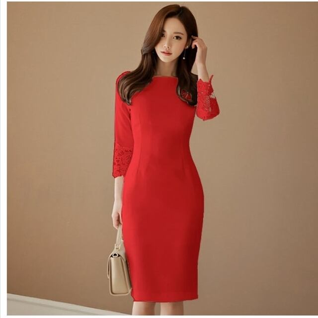 ボートネック ワンピース オシャレ ワンピース ひざ丈 長袖 春物 上品 レースステッチ ボートネック タイト バックスリット