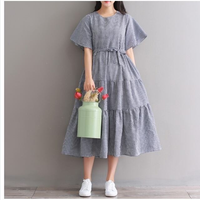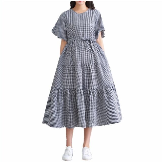 ボートネック ワンピース レディースミモレワンピースロングワンピース半袖ボートネックチェック柄フレアワンピースふんわりウエストゴム