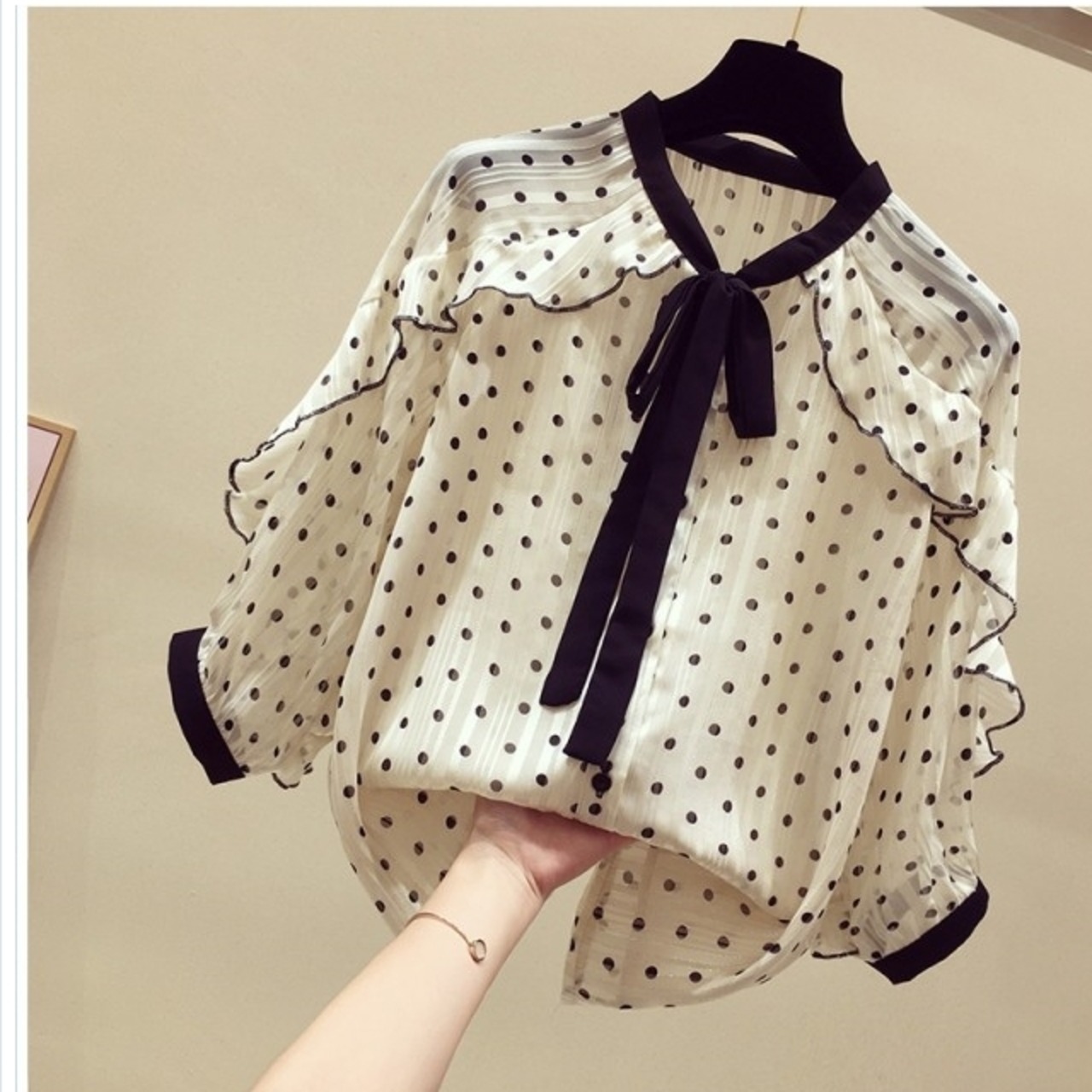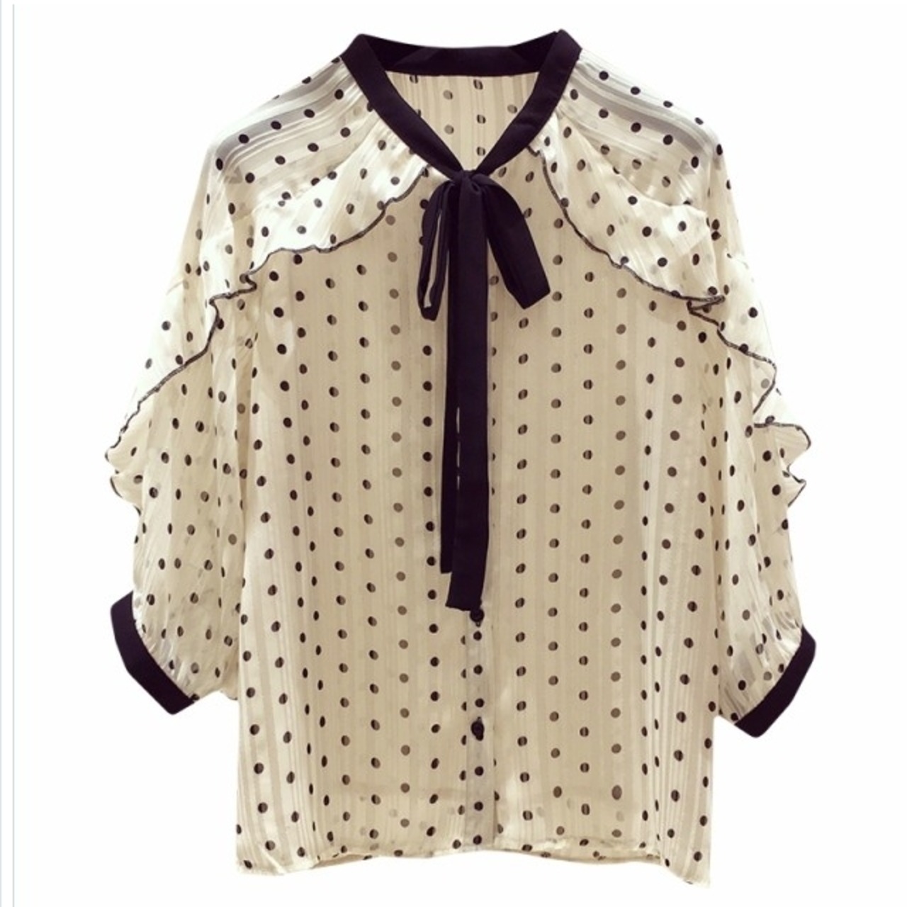 ゆめかわいい トップス レディース春夏 大人 ガーリー ドット 柄 モノクロ シンプル シフォン Vネック 半袖 シャツ ブラウス プチプラ 着