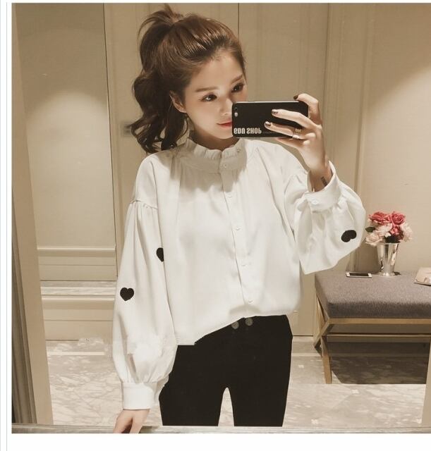 ゆめかわいい トップス ハート プチフリルハイネック 長袖ブラウス 韓国 オルチャン 袖コンシャス パフ ガーリー 原宿系 ゆめかわ 可愛い