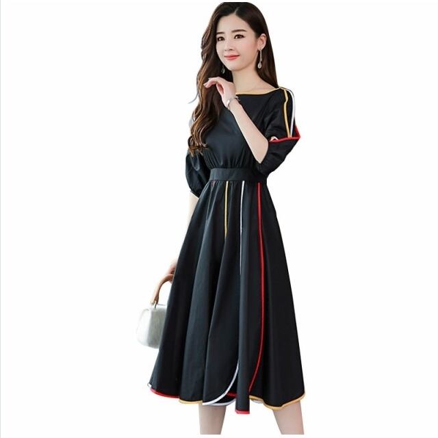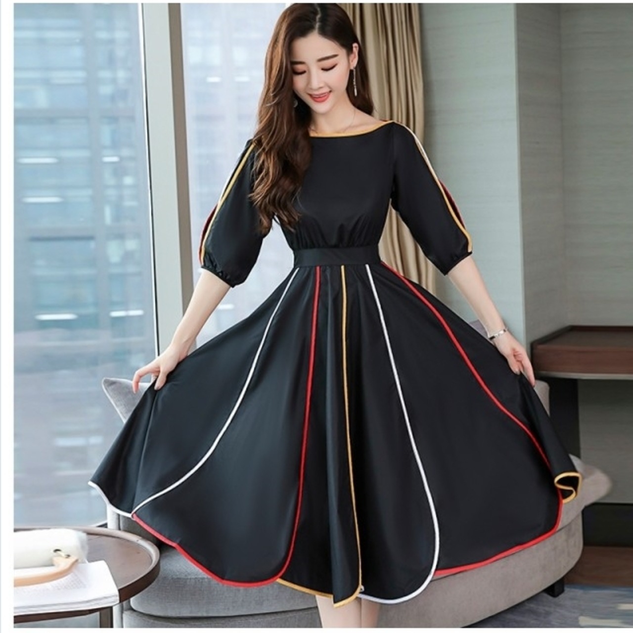 ボートネック ワンピース ワンピース フレア カラーライン パイピング ハイウエスト切り替え ボートネック エレガント