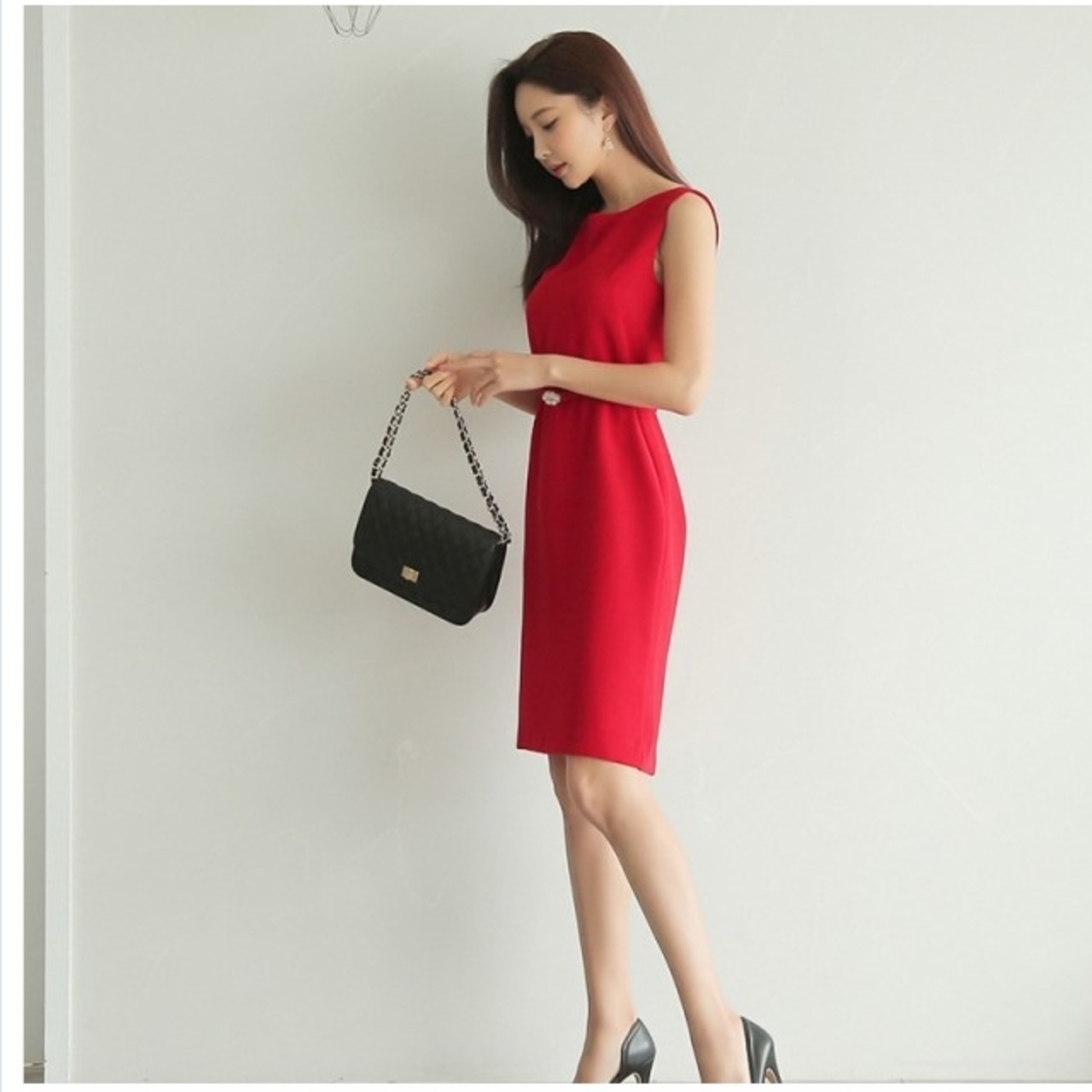 ボートネック ワンピース シングルサイドラッフル タイトワンピース ノースリーブ フィット シンプル 高級感 無地 お呼ばれ 涼しげ ボー