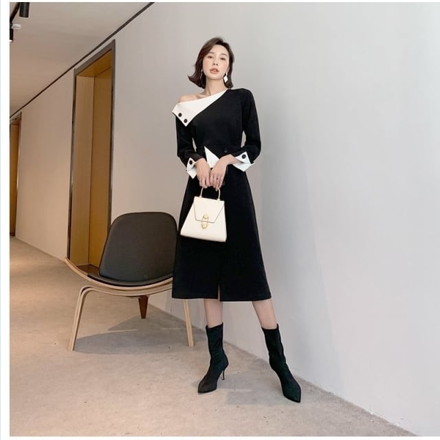 ボートネック ワンピース クラシック ワンピース スリム ボートネック バイカラー エレガント レトロ