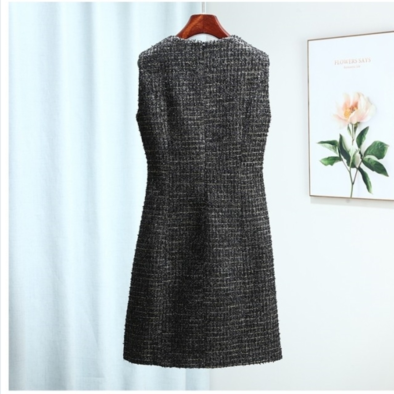 ボートネック ワンピース ワンピース 膝丈 半袖 ツイード ボートネック 2 黒 レディース