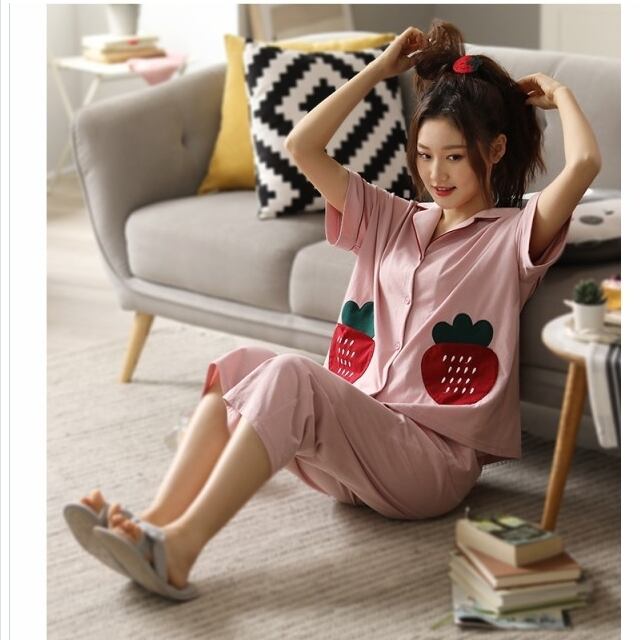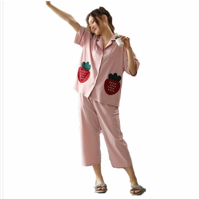 ルームウェア レディース 大きいサイズ 前開き いちご柄 セットアップ コットン 大きいサイズ 部屋着 長袖 上下セット おしゃれ かわいい