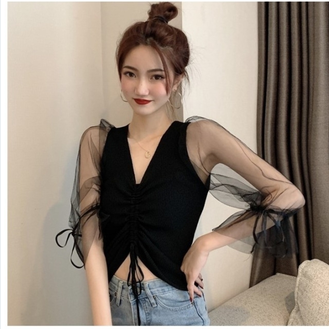 シアー トップス シアーブラウス トップス レディース ブラウス シアー シースルー袖 Vネック パフスリーブ フロントシャーリング フェミ