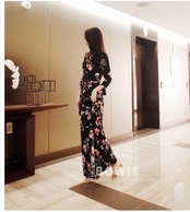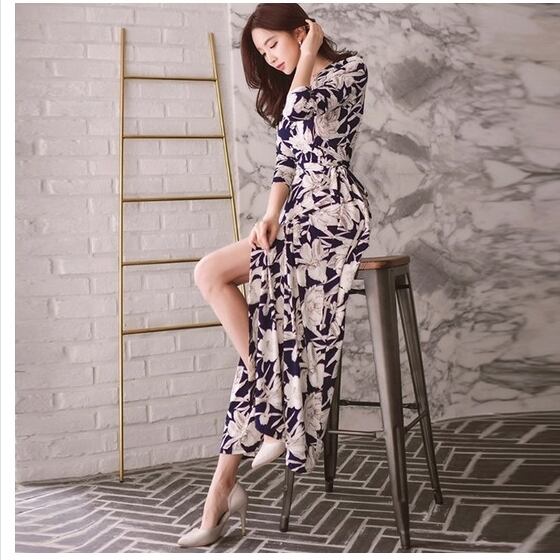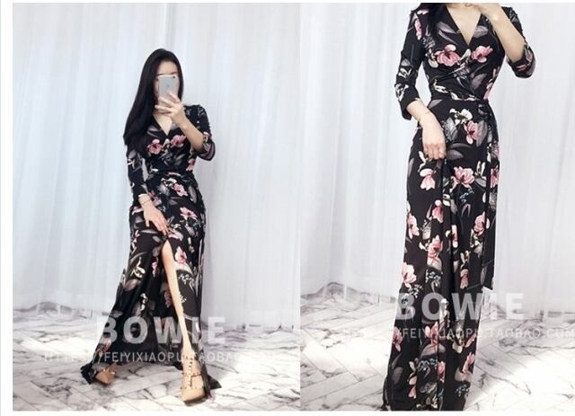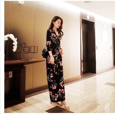 花柄 ロングワンピース 長袖 ワンピース マキシ丈 ハイウエスト スリット Vネック ロング丈 長袖 シンプル エレガント キャバ レトロ 大