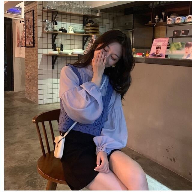 シアー トップス シャツとニットベスト レディース 長袖 シアーシャツ ランタンスリーブ スタントカラー 春 カジュアル お出かけ 全3色
