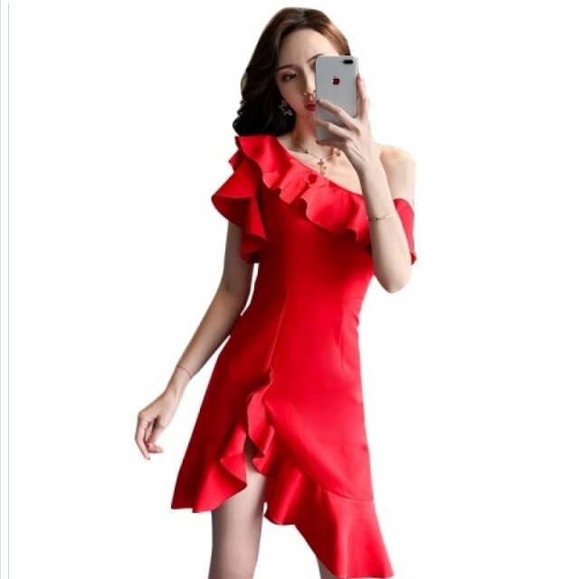 プリーツスカート ロング 花柄 韓国 パーティードレス ワンショルダー アシンメトリー ワンピース 結婚式 二次会 秋冬 パーティー お呼ば