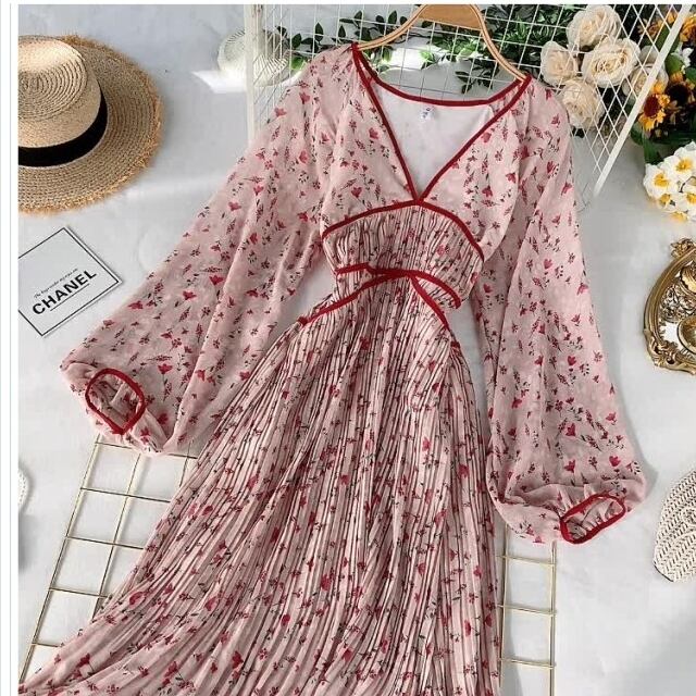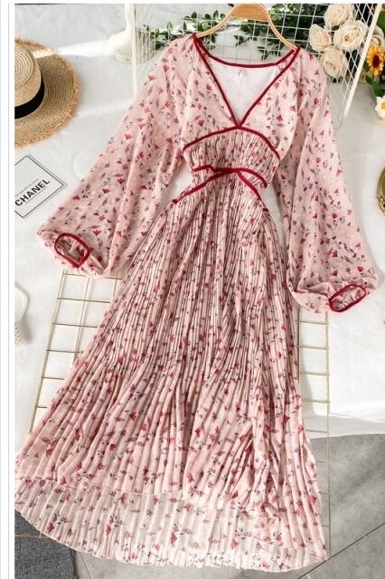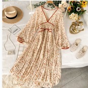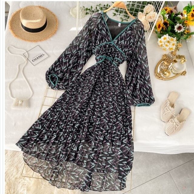 プリーツスカート ロング 花柄 ワンピース シフォンワンピース ロングワンピース 大きいサイズ プリーツスカート Vネック 長袖 レトロ 花