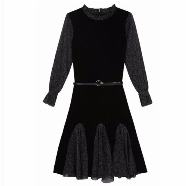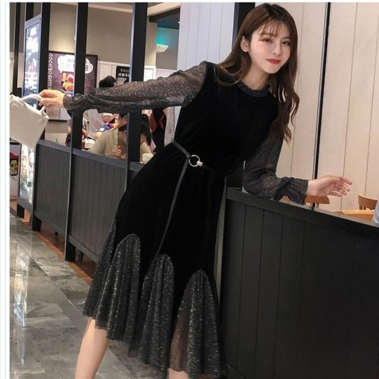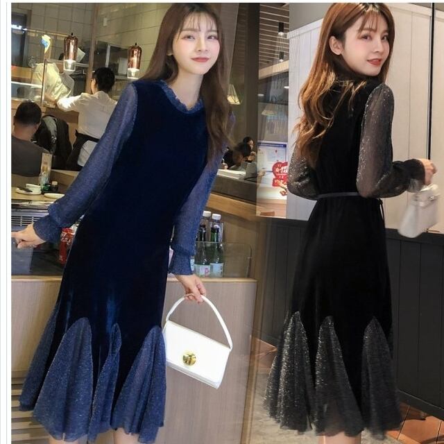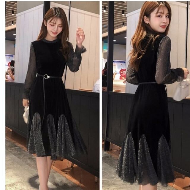 ゆる ワンピース ロングドレス 演奏会 パーティードレス 結婚式 ロング丈 ワンピース ドレス シースルー 異素材 透け感 ラメ ベルベット