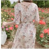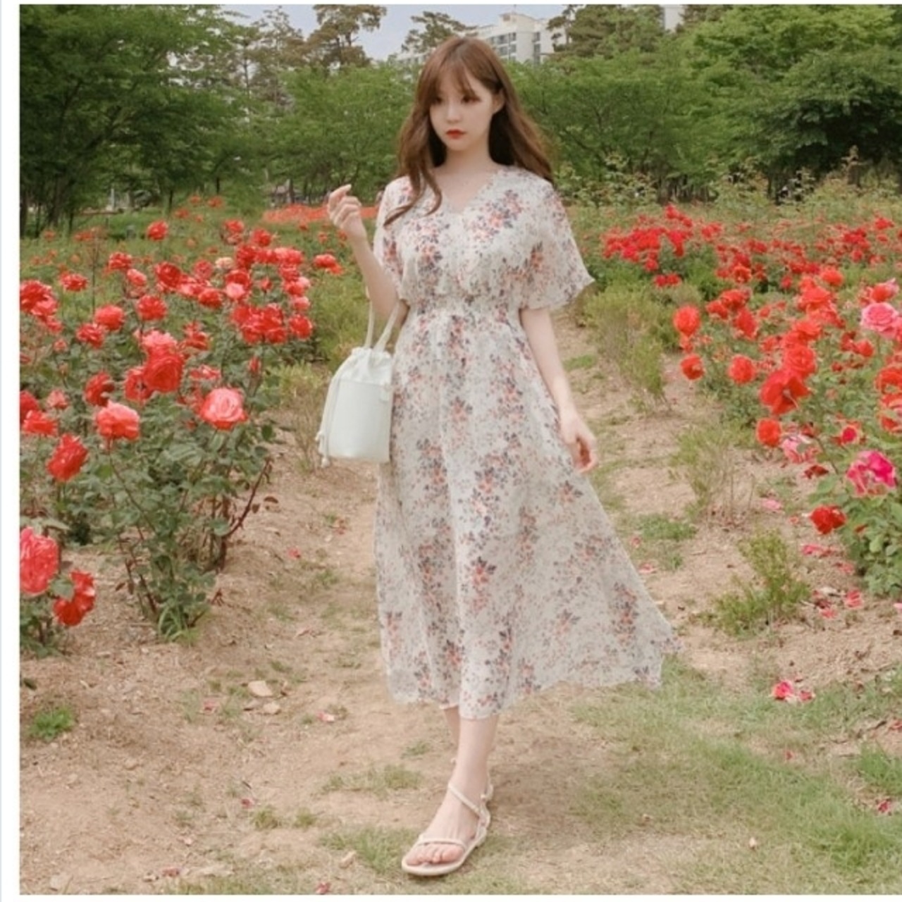 フレアマキシワンピース 春 夏 ロングワンピース レディース 花柄ワンピース 花柄 ハイウエスト ロング丈 マキシ丈 Vネック 半袖 フレア
