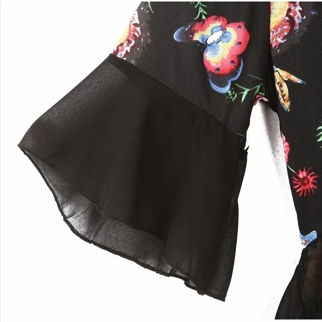 フレアマキシワンピース 春 夏 ワンピース シフォンワンピース ロング丈 マキシ丈 花柄 Vネック 半袖 フリル フレア 上品 春夏