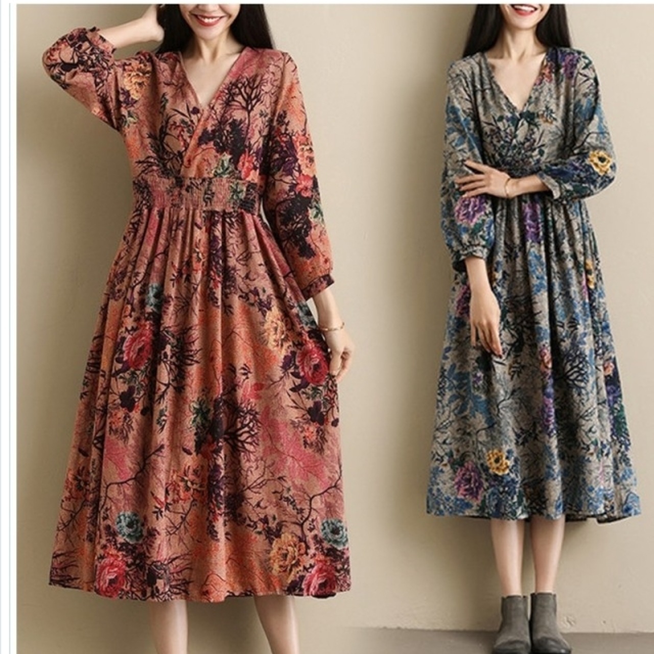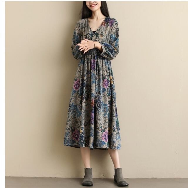 ゆる ワンピース ワンピース レディース 春 綿麻混 花柄 ロング丈 長袖 Vネック aライン お洒落 ゆったり 体型カバー ママ 可愛い ゆるっ