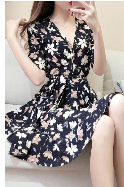 プリーツスカート ロング 花柄 ワンピース ミニ フレア 半袖 カシュクール フラワープリント ウエストリボン リネン ブラック 上品 フェ