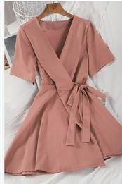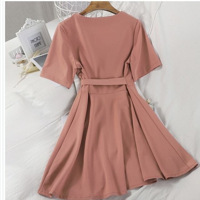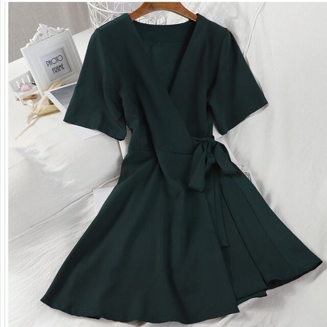 プリーツスカート ロング 花柄 ワンピース フレア 膝上 ミニ ワイドスリーブ ウエストリボン カシュクール Vネック 半袖 無地 カーキ グ