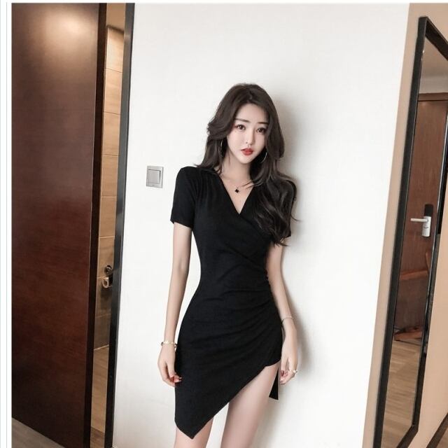 フェミニン ワンピース サイドギャザー カシュクール チューリップワンピース 半袖 フィット フェミニン 高級感 無地 お呼ばれ 膝上丈 ラ