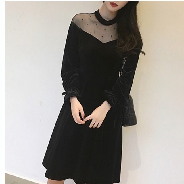 プリーツスカート ロング 花柄 韓国 ドレス 長袖 ひざ上丈 オフショルダー シースルー ベルベット ワンピース スカート フォーマル 結婚
