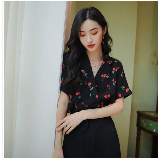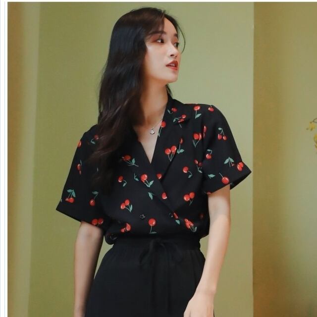 ゆめかわいい トップス レディース春夏 ゆめかわいい フルーツ柄 チェリー 柄 半袖 Vネック シャツ ブラウス プチプラ トレンド レトロ