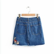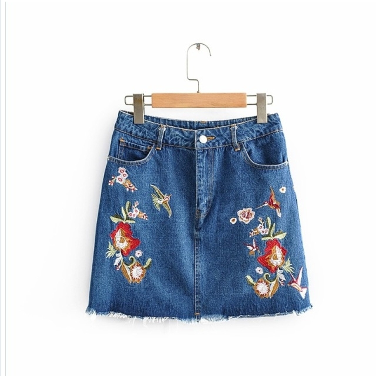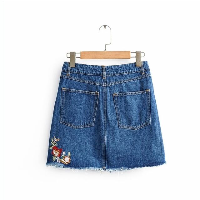 プリーツスカート ロング 花柄 デニム スカート 台形 Aライン ミニ フレイドヘム 鳥 風船 刺繍 フロントスリット ブルー カジュアル ガ