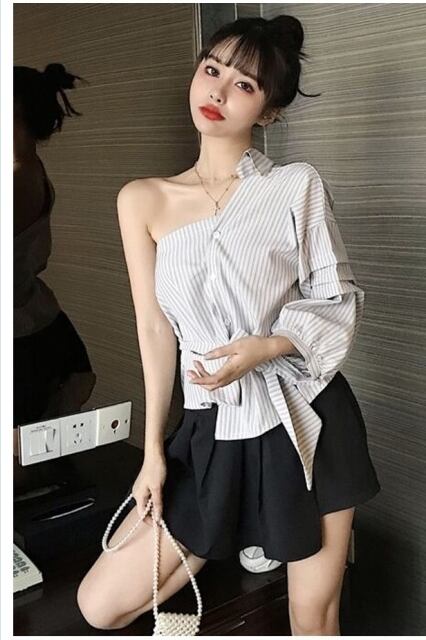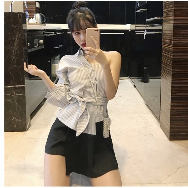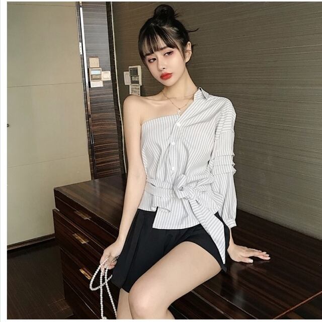フェミニン ブラウス セットアップ ブラウス レディース ストライプ 肩出し トップス ボトムス