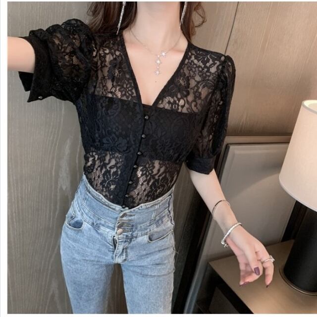 フェミニン ブラウス トップス ブラウス レディース レース Vネック 花柄 長袖 フレア袖 体型カバー シースルー 透け感 大人可愛い カジ