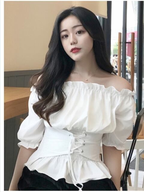 フェミニン ブラウス 秋新作 大きいサイズ コルセット風ベルトオフショルブラウス トップス ブラウス オフショルブラウス オフショル フ
