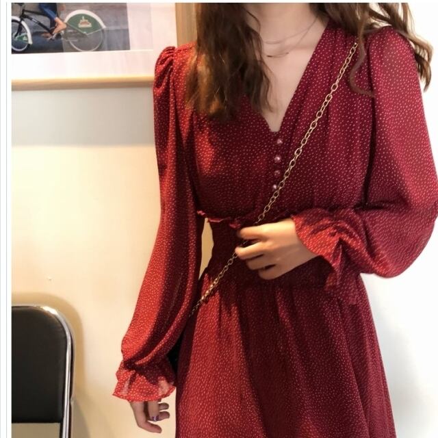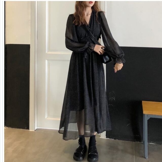フェミニン ワンピース ワンピース ロングワンピース ドット柄 シフォン キャンディスリーブ シースルー ウエストマーク フェミニン ガー