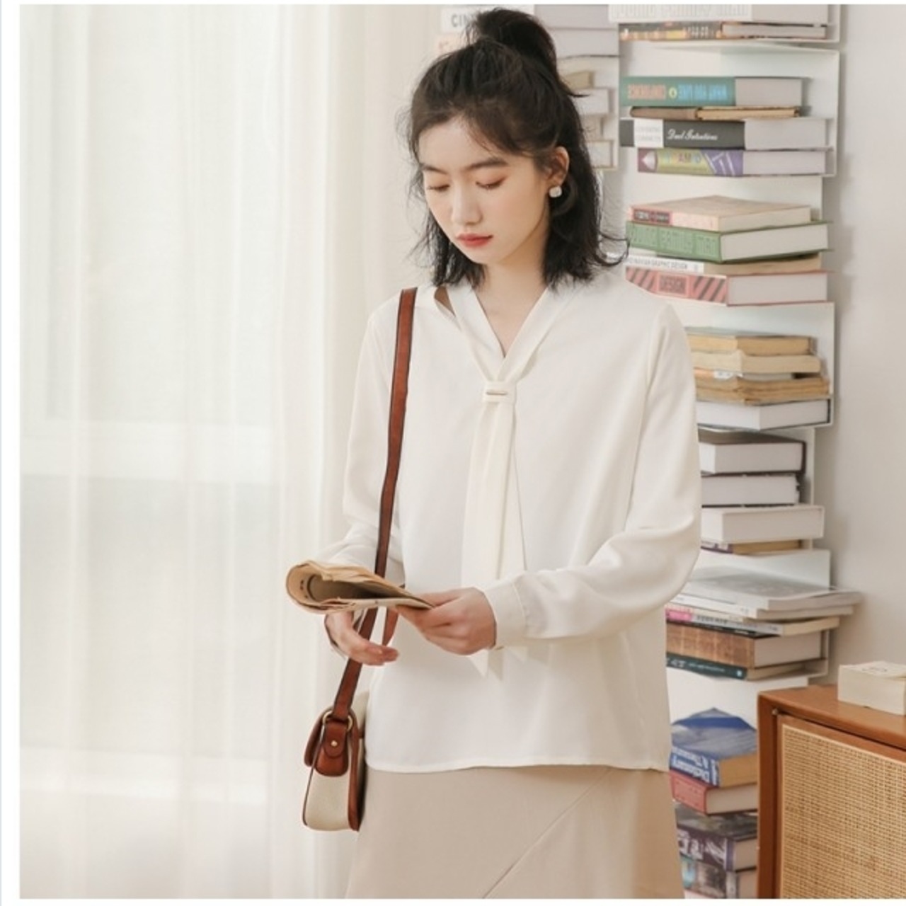 フェミニンブラウス ボウタイカラー フェミニンシフォンブラウス 長袖 大人可愛い シンプル 無地 オフィス 30代 40代 S M L おすすめ お