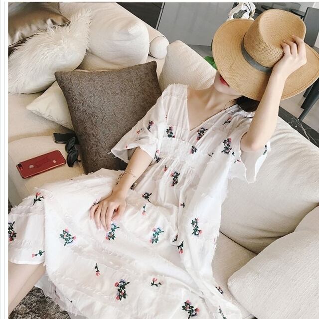 フェミニン ワンピース 花柄 刺繍 ロングワンピース Vネック ミモレ トレンド 流行 女子会 リゾート 春夏 ホワイト 白 ビーチ ゆったり
