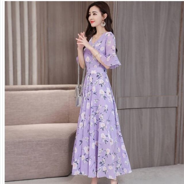 ロリ ワンピース レディース フラワーワンピース ラベンダー 総柄 春夏 半袖 ロング Aライン フレア ミモレ丈 フェミニン 上品 おでかけ