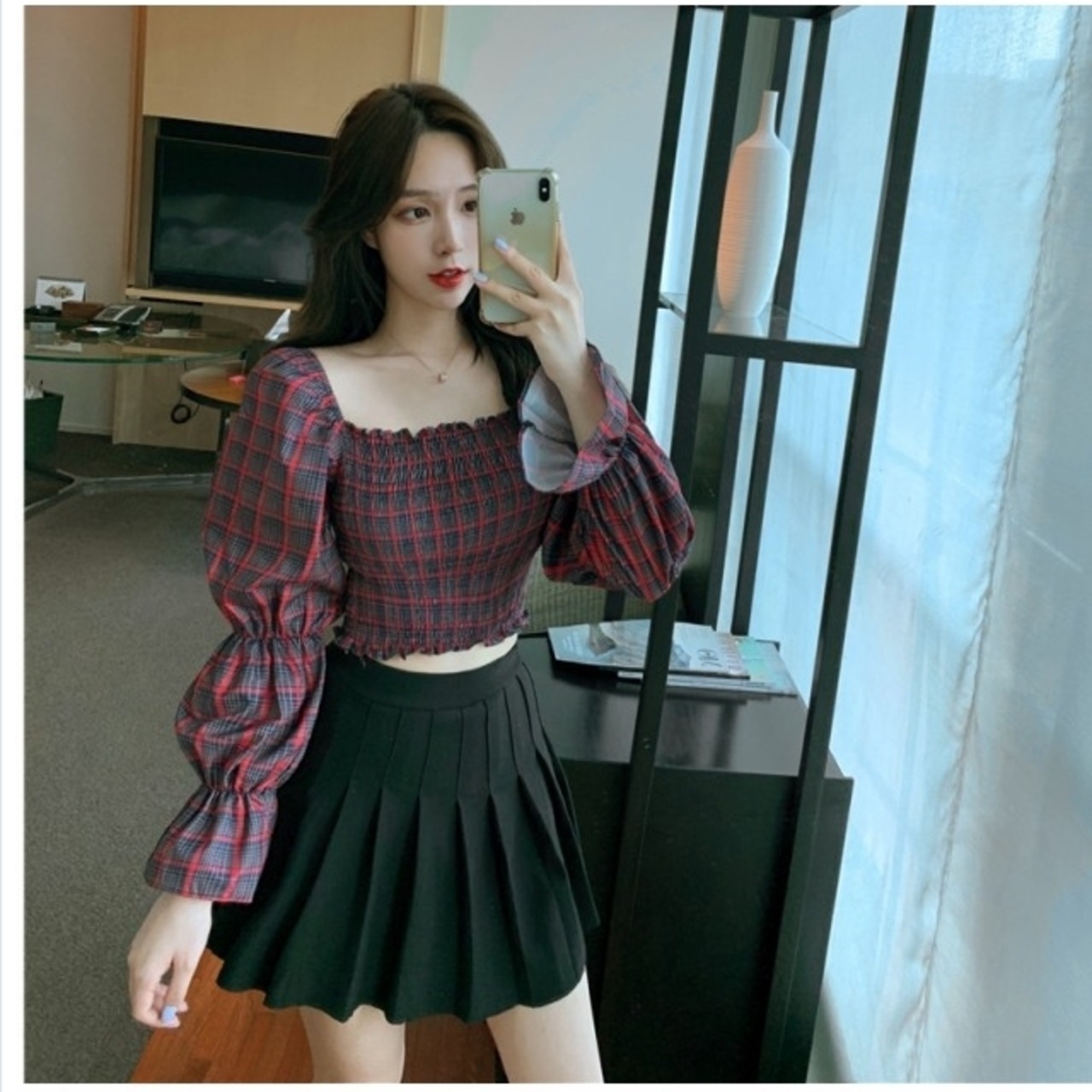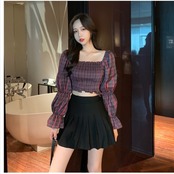 フェミニン ブラウス ブラウス 長袖 チェック柄 スクエアネック パフスリーブ レトロ 短め丈 ワインレッド カジュアル 秋 お出かけ