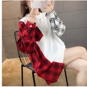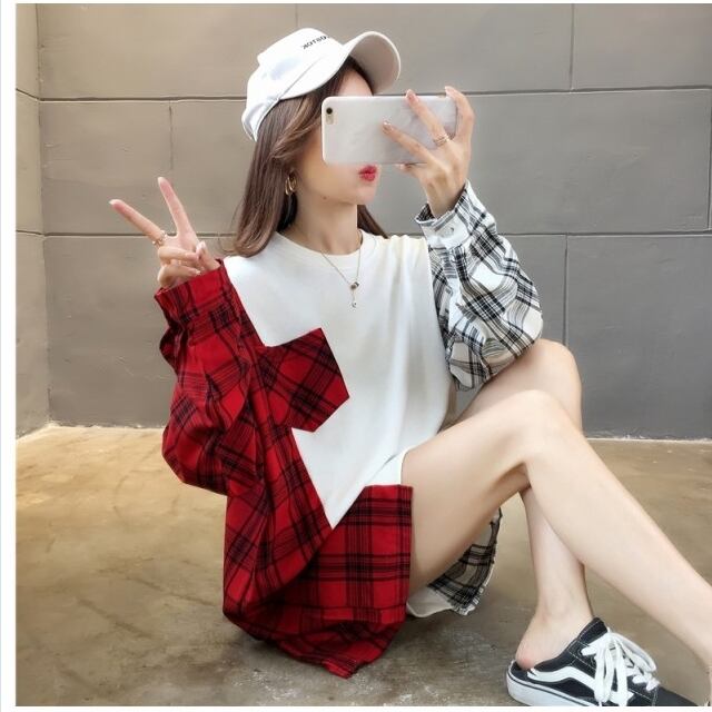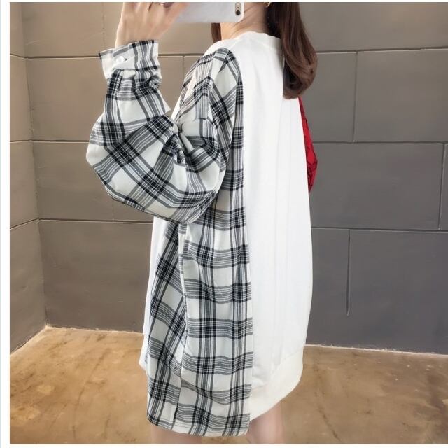 シャツワンピース ロング丈 長袖 レディース秋冬 原宿系 個性的なデザイン チェック 配色 アシメ 長袖 シャツ スウェット ワンピース ア