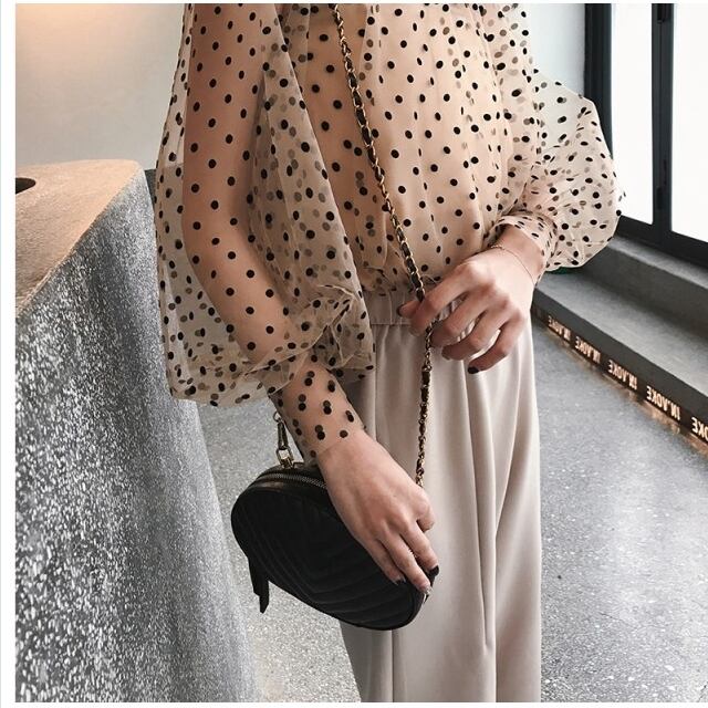 フェミニン ブラウス シアーブラウス レディース おしゃれ 春 ハイネック 長袖 シースルー 透け感 ドット柄 ベルスリーブ ベージュ ブラ