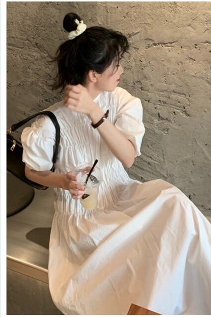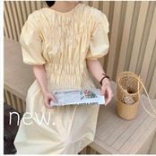 フェミニン ブラウス ブラウス レディース おしゃれ ギャザー 長袖 クルーネック パフスリーブ ブラック 黒 アイボリー ぺプラム フェミ