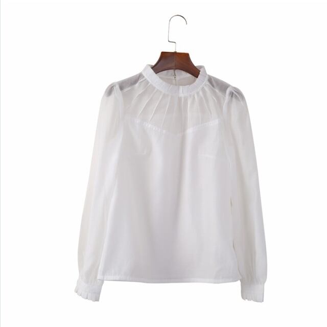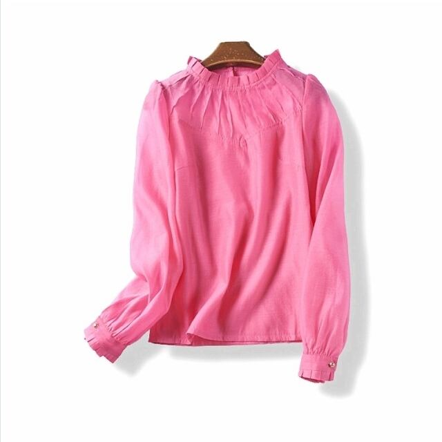 フェミニン ブラウス コライユ コットン ピーチ バイオ リボン フリル衿 レディース 立ち襟 オフィス 長袖 春 夏