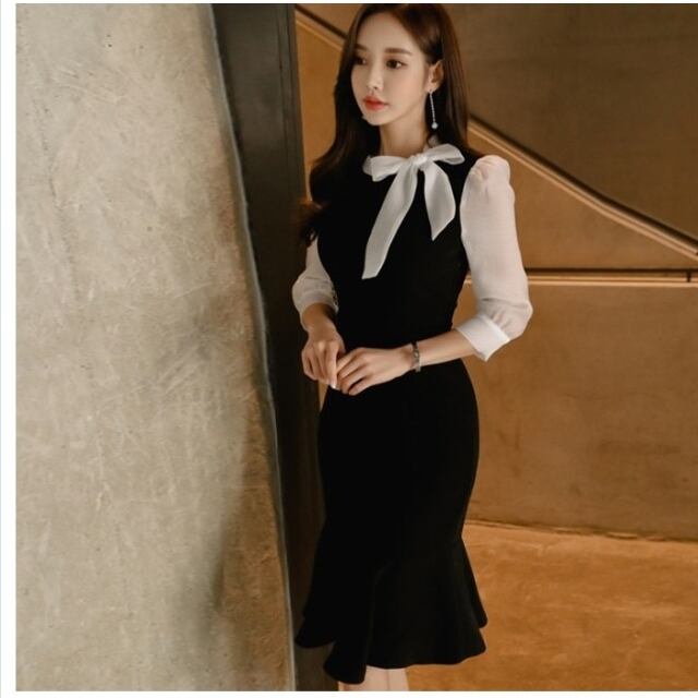 ワンピース マーメイド レディース マーメイドワンピース きれいめ リボンネック ひざ丈 通勤 ワンピース タイトワンピース 二次会 エレ