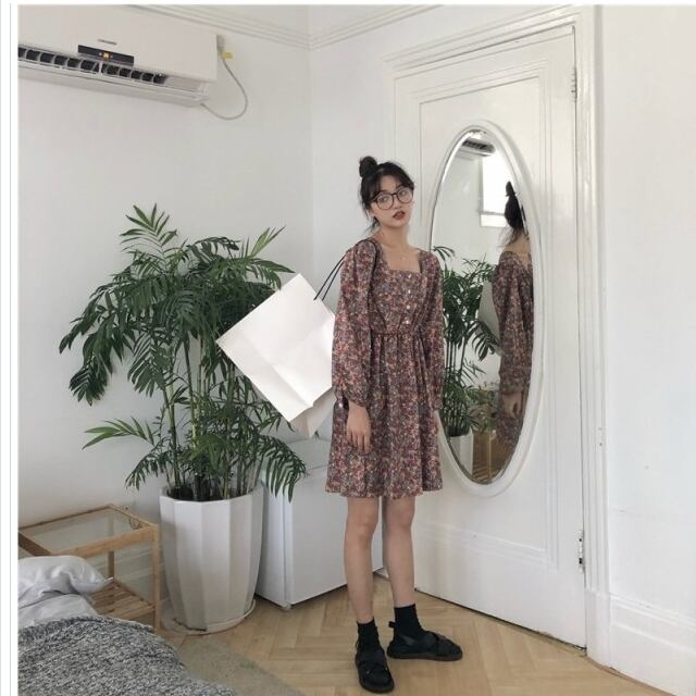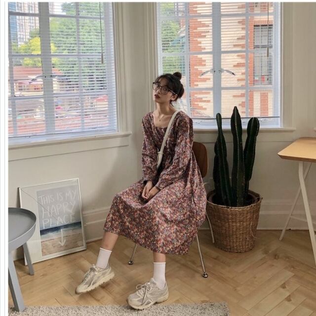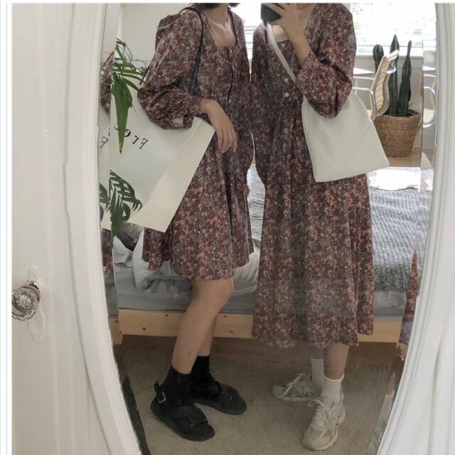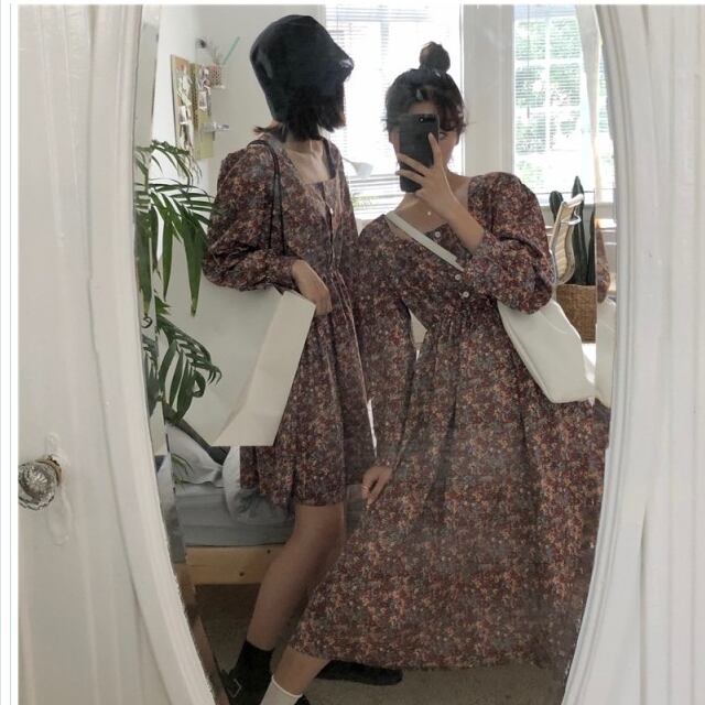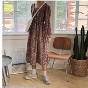 フェミニン ワンピース M-4L 洗える ウエスト切替小花柄ギャザーマキシワンピース