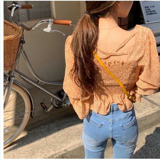 フェミニン ブラウス ブラウス レディース おしゃれ スクエアネック 半袖 パフスリーブ 花柄 オレンジ ブルー 青 フェミニン 大人可愛い