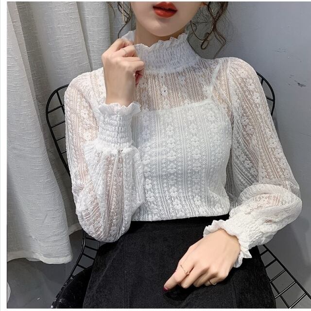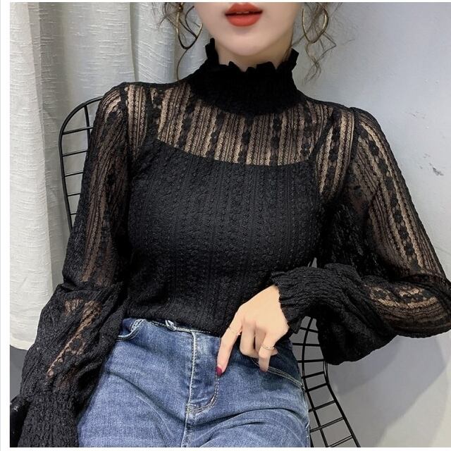 フェミニン ブラウス レディース 秋 冬 長袖 シャツ ブラウス カットソー 透け感 シースルー ハイネック フリルネック パフスリーブ フェ
