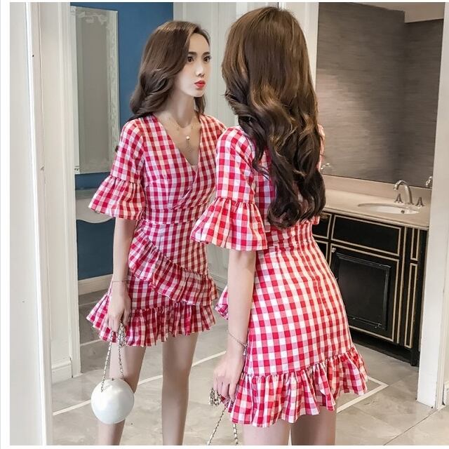 ワンピース マーメイド ワンピース vネック チェック柄 フレア袖 レディース マーメイド ドレス 裾フレア フリル ミニ ショート丈 チュニ