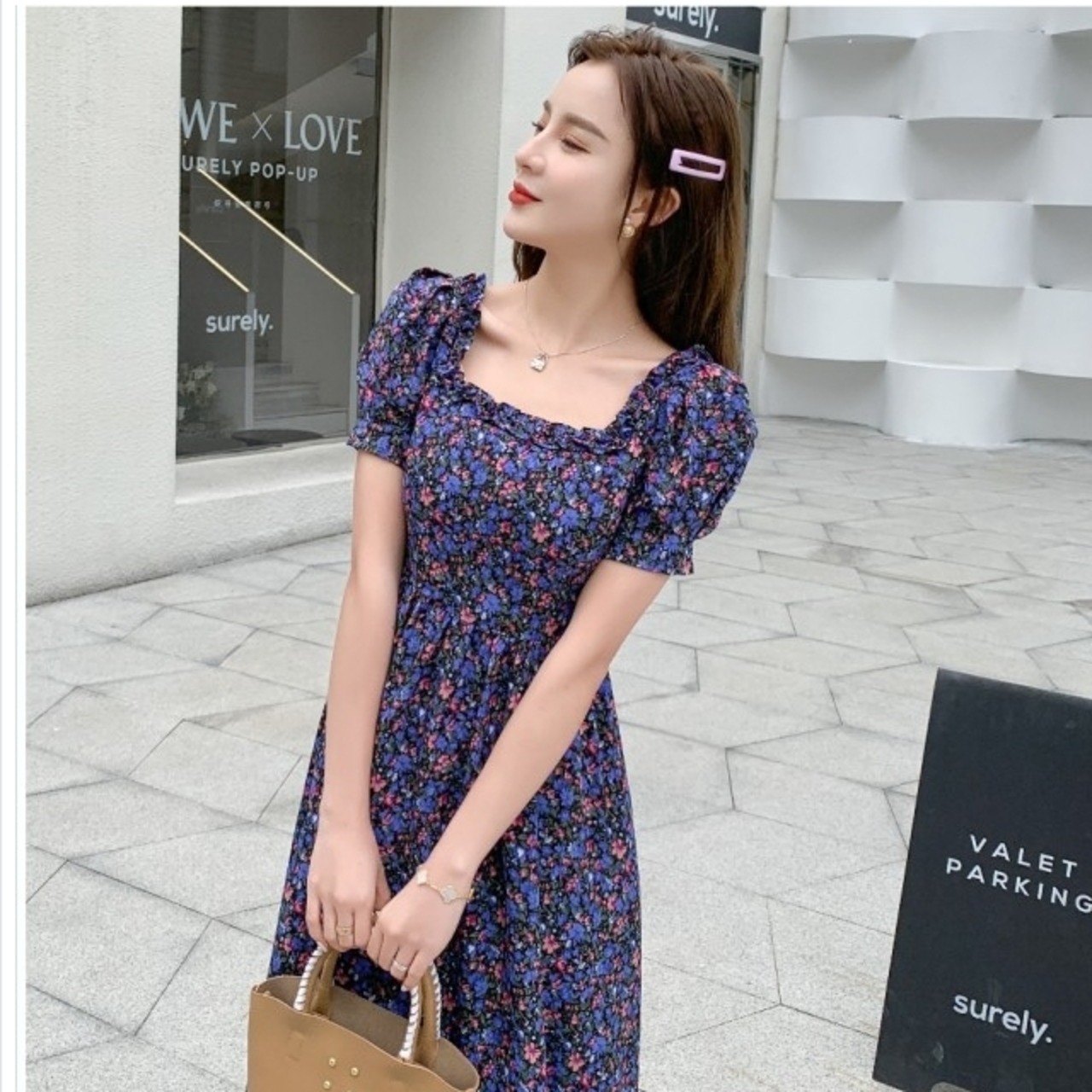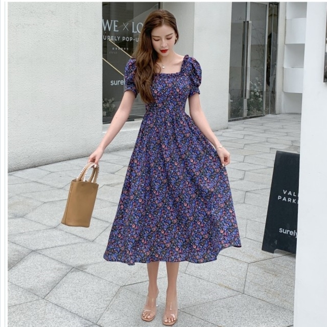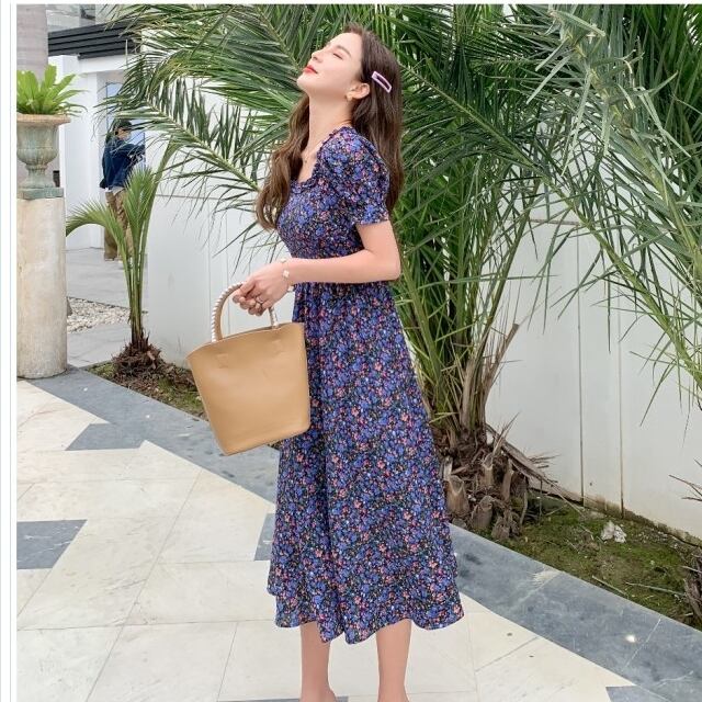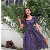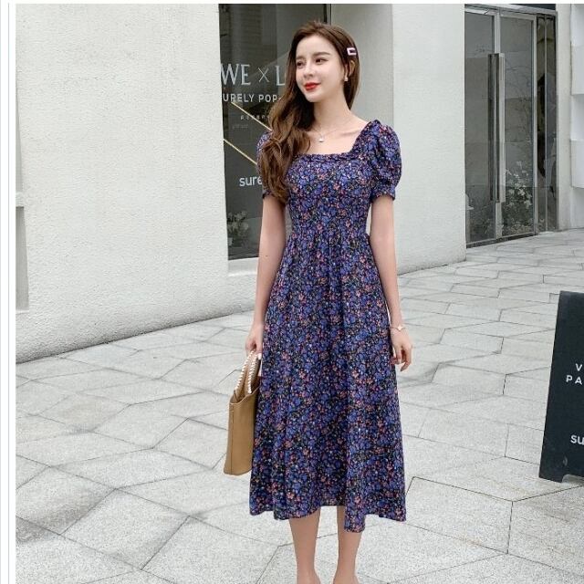 ワンピース 小花柄 小花柄スクエアネック 半袖パフスリーブ ミディ丈フレアワンピース ウエストマーク レディース春夏 パープル S M L