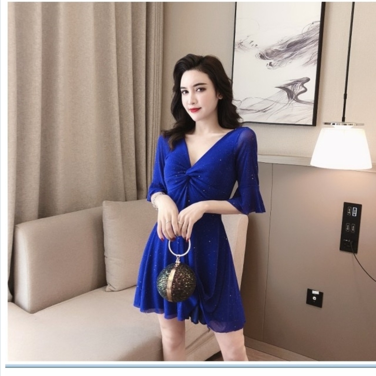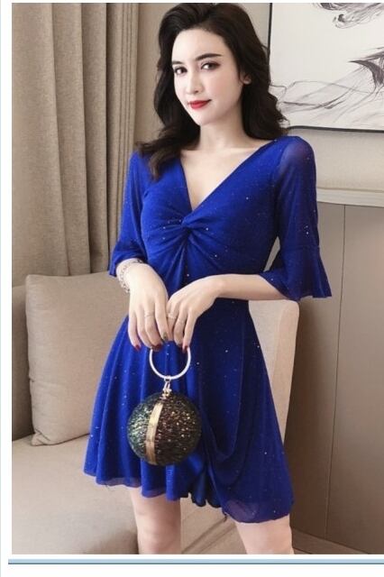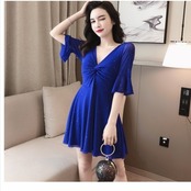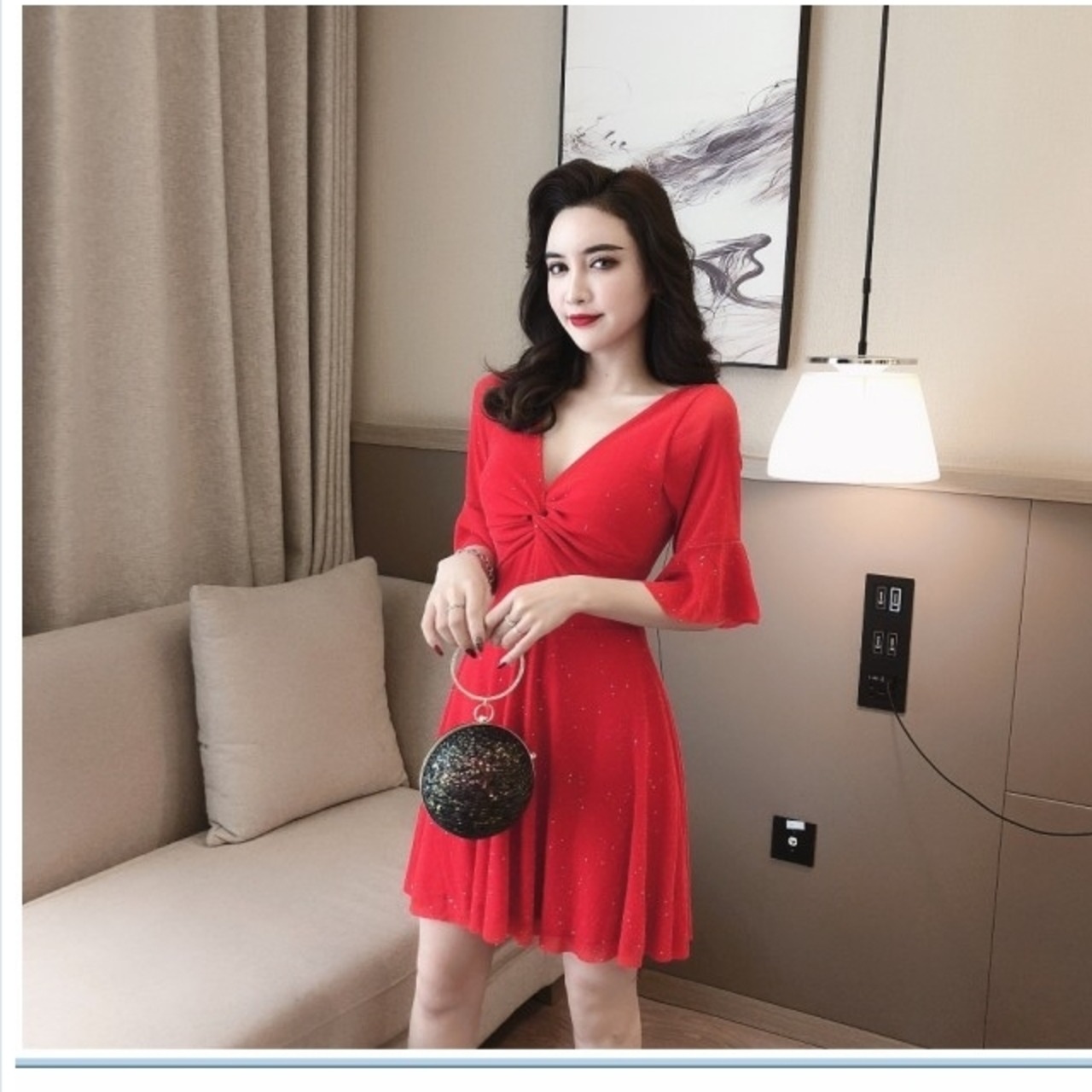ワンピース マーメイド フレアスリーブ ワンピース レディース 半袖 細身 二次会 女性用 無地 ロングワンピ Vネック 人魚マーメイド 20代