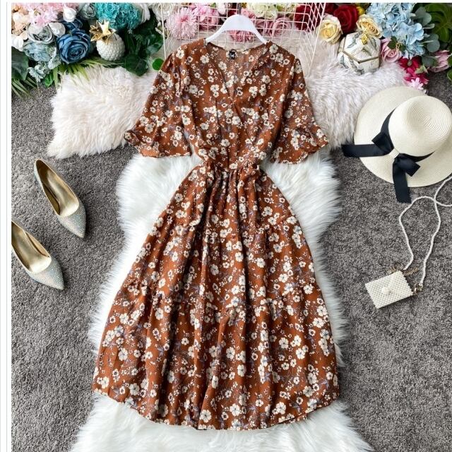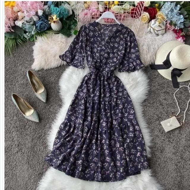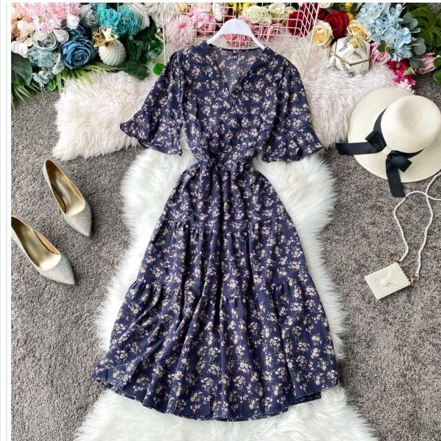 ワンピース 小花柄 春新作 花柄ボリューム袖ワンピース 大きいサイズ レディース ワンピース ワンピ 花柄ワンピース ミモレ丈ワンピース