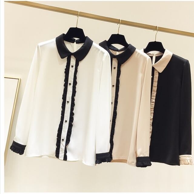 フェミニンブラウス 韓国 ファッション レディース トップス ブラウス シャツ 春 秋 冬 カジュアル モノトーン バイカラー レース使い ド