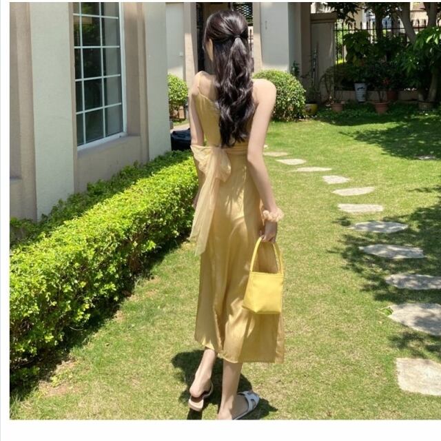 大きいサイズ サマーワンピース オレンジ ワンピース イエローワンピース ハイウエスト ノースリーブ ホルターネック ワンピース ミモレ