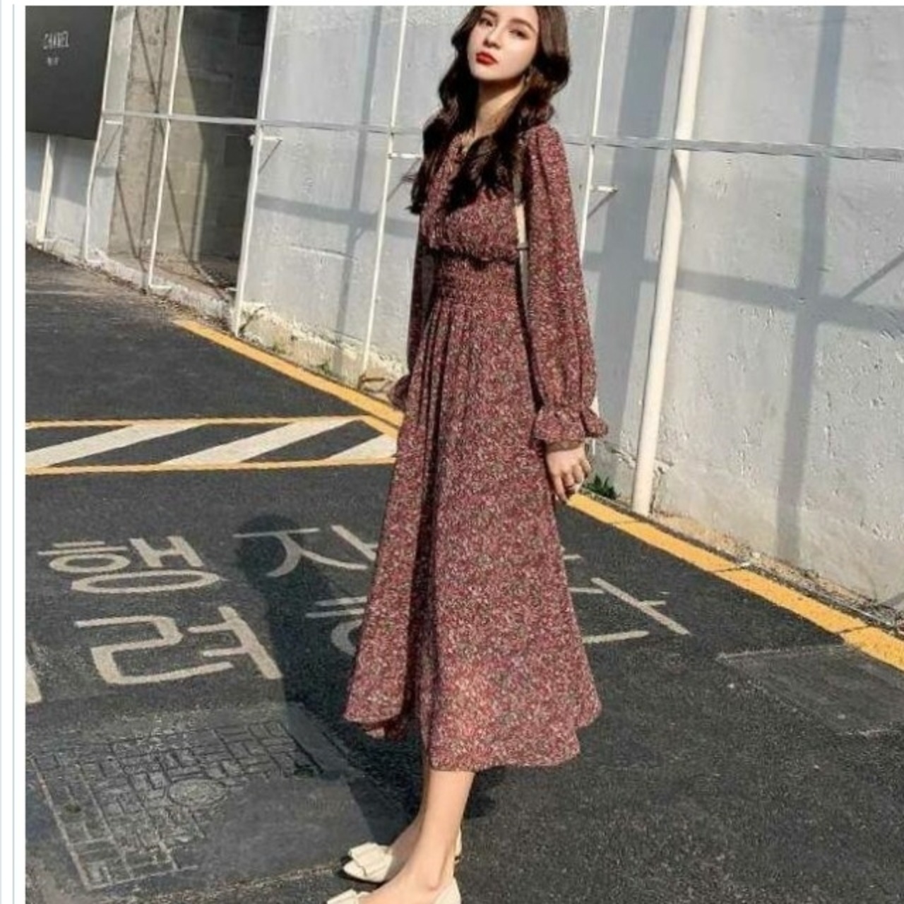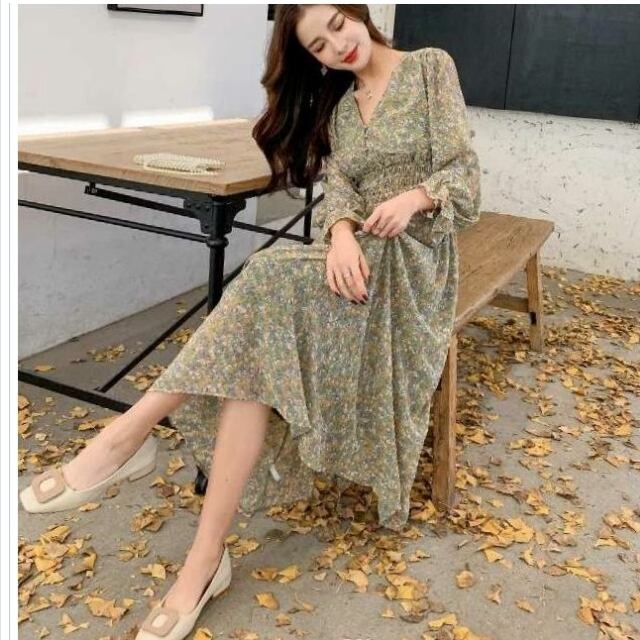 ワンピース 小花柄 小花柄Vネック長袖フレアワンピース ミディ丈 薄手 ウエストゴム レディース春夏 パープル グリーン S M L